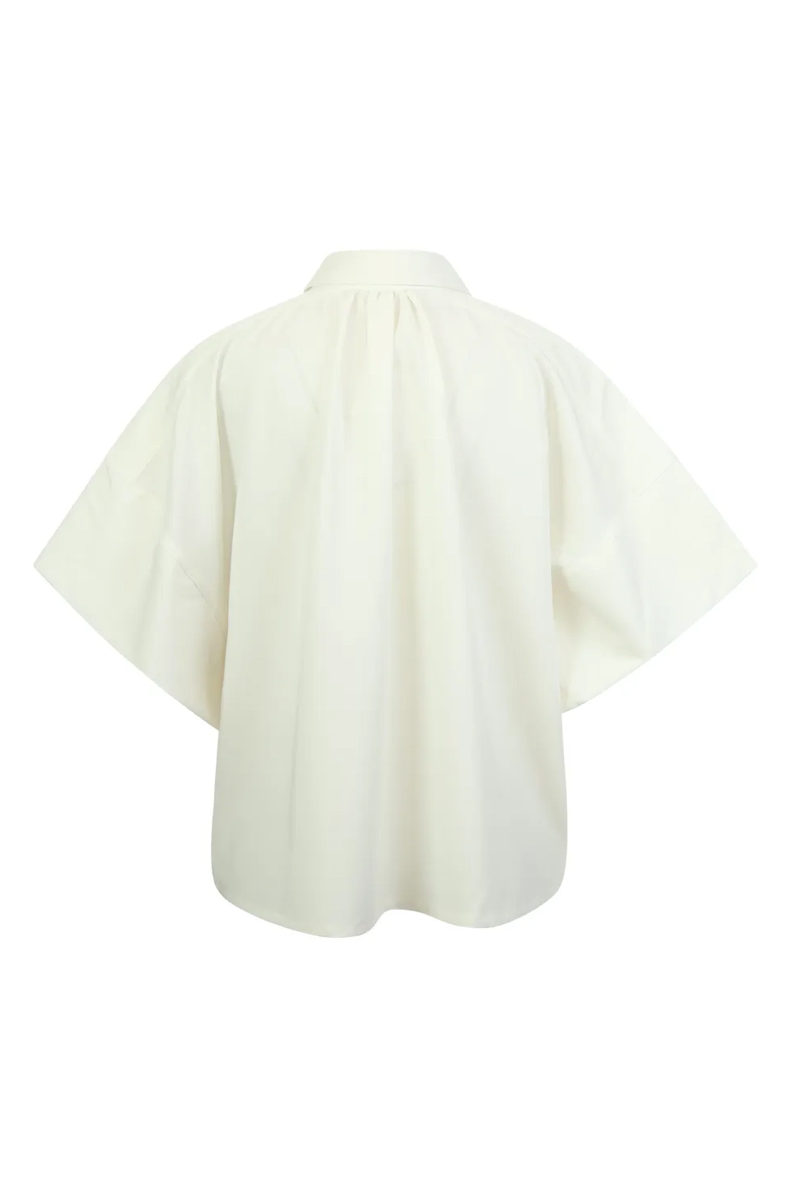 Dit ecru t-shirt van Aimee The Label heeft een kraag en een korte knoopsluiting aan de voorzijde. Het model is voorzien van wijde korte mouwen met een verlaagde schoudernaad. Op de borst is een klein geborduurd logo zichtbaar. De achterzijde van dit shirt is afgewerkt met plooiing bij de nek voor een soepele valling van de stof.