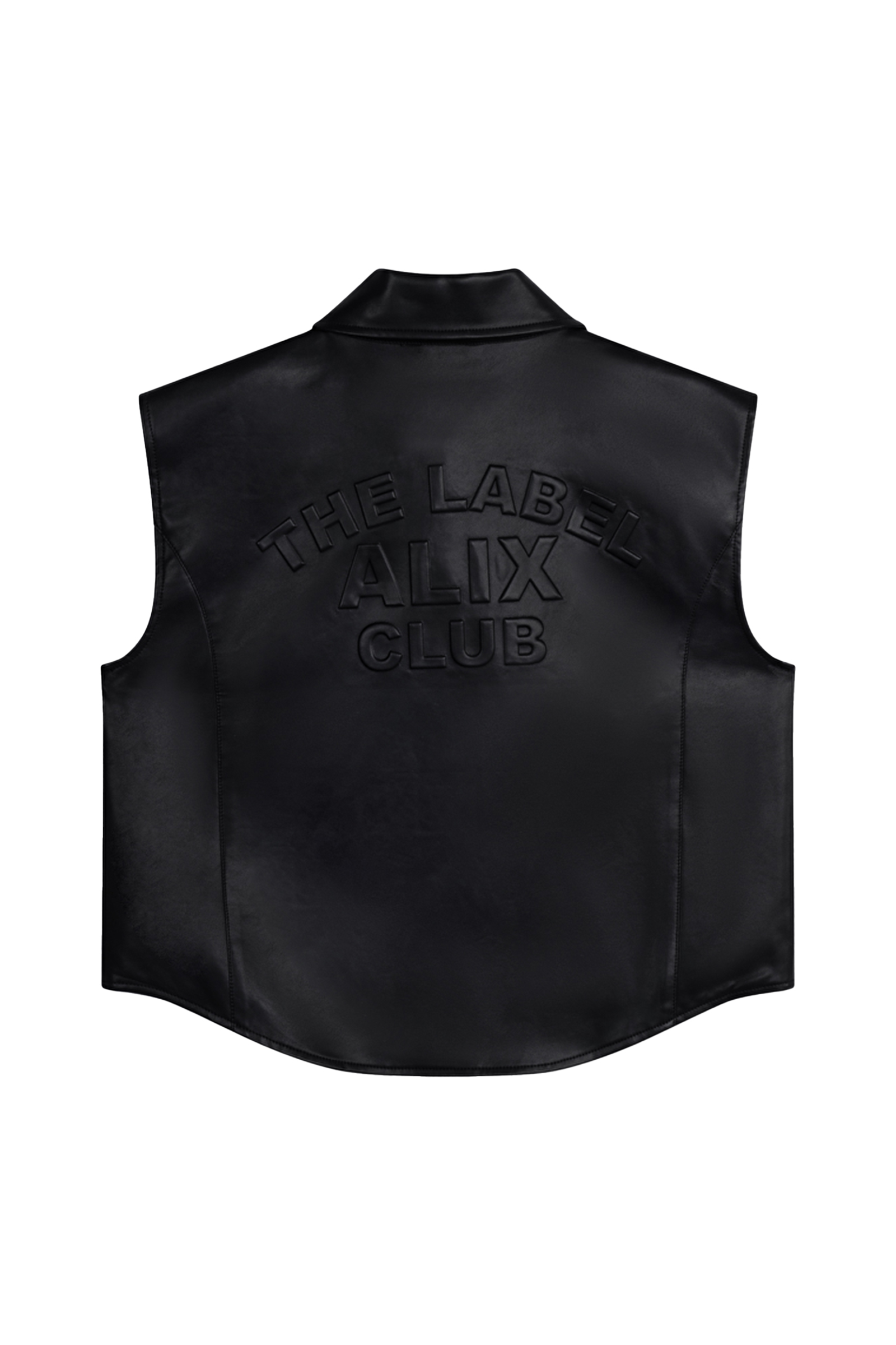 Deze zwarte top van Alix the Label heeft een leerlook en is voorzien van een klassieke kraag. Het item sluit met een blinde knoopsluiting aan de voorzijde. Op de rugzijde staat de tekst THE LABEL ALIX CLUB in een groot reliëf. De voorzijde heeft twee horizontale naden ter hoogte van de borst. Je draagt dit mouwloze item als bovenstuk of als extra laag over een shirt.