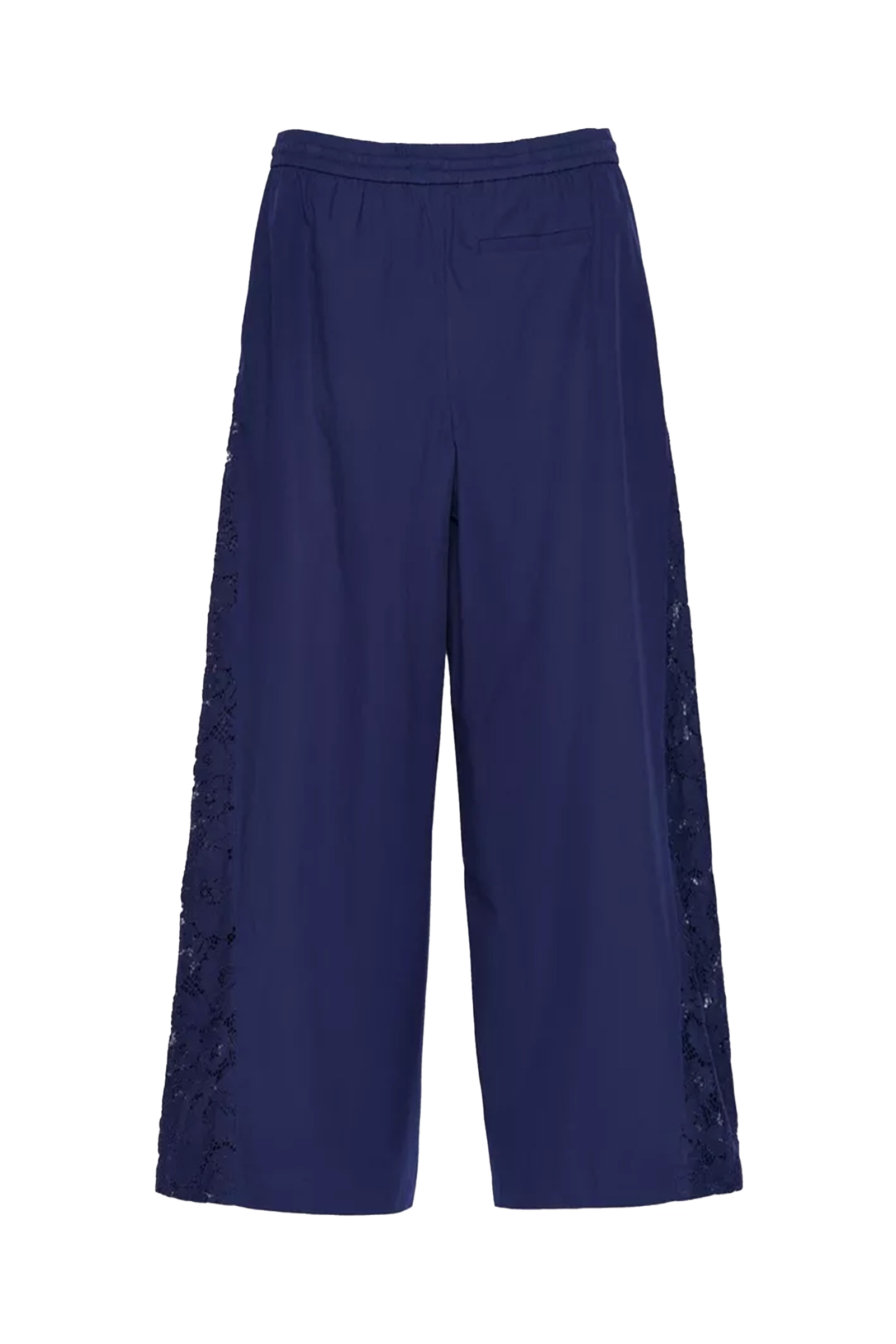 Deze donkerblauwe dames broek van CKS is uitgevoerd in een wijde, cropped fit. De comfortabele broek, model TOBYWIDE, heeft een elastische tailleband met een verstelbaar trekkoord als sluiting aan de voorzijde. De zijkanten van de broekspijpen zijn voorzien van verticale inzetstukken van kant, wat zorgt voor een opengewerkt design. Het kledingstuk is gemaakt van 100% Lyocell.Pasvorm en Stijladvies