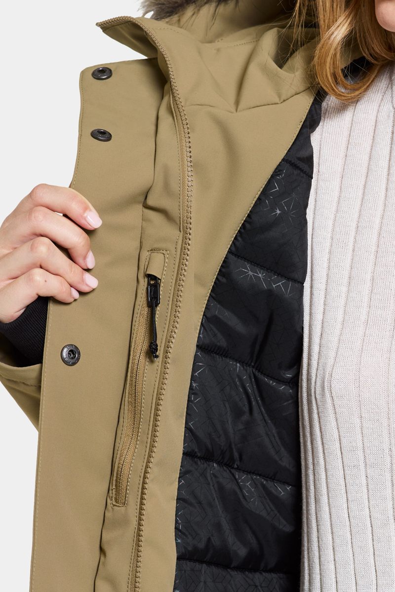 Deze dames jas van Didriksons is voorzien van een ritssluiting en heeft zakken en een capuchon.