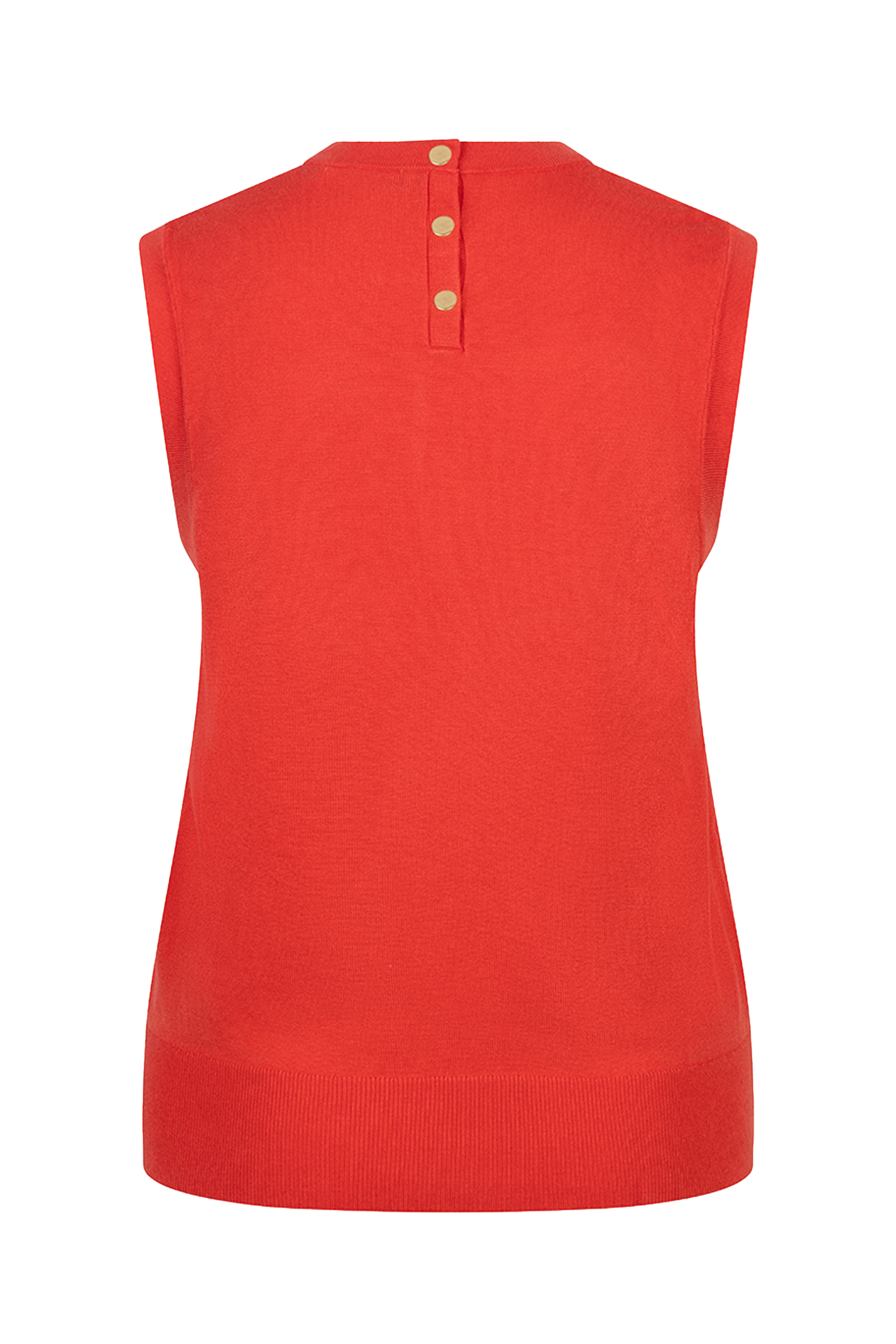 Deze mouwloze dames top rood van Esqualo is uitgevoerd in een fijngebreide basic knit. De gebreide top heeft een ronde halslijn en een ribgebreide boord aan de onderzijde. Aan de achterkant van de hals is de dames trui voorzien van drie goudkleurige knopen als sluiting. Dit gebreide kledingstuk voelt comfortabel aan en is een toegankelijke aanvulling op jouw casual garderobe.Pasvorm en Stijladvies