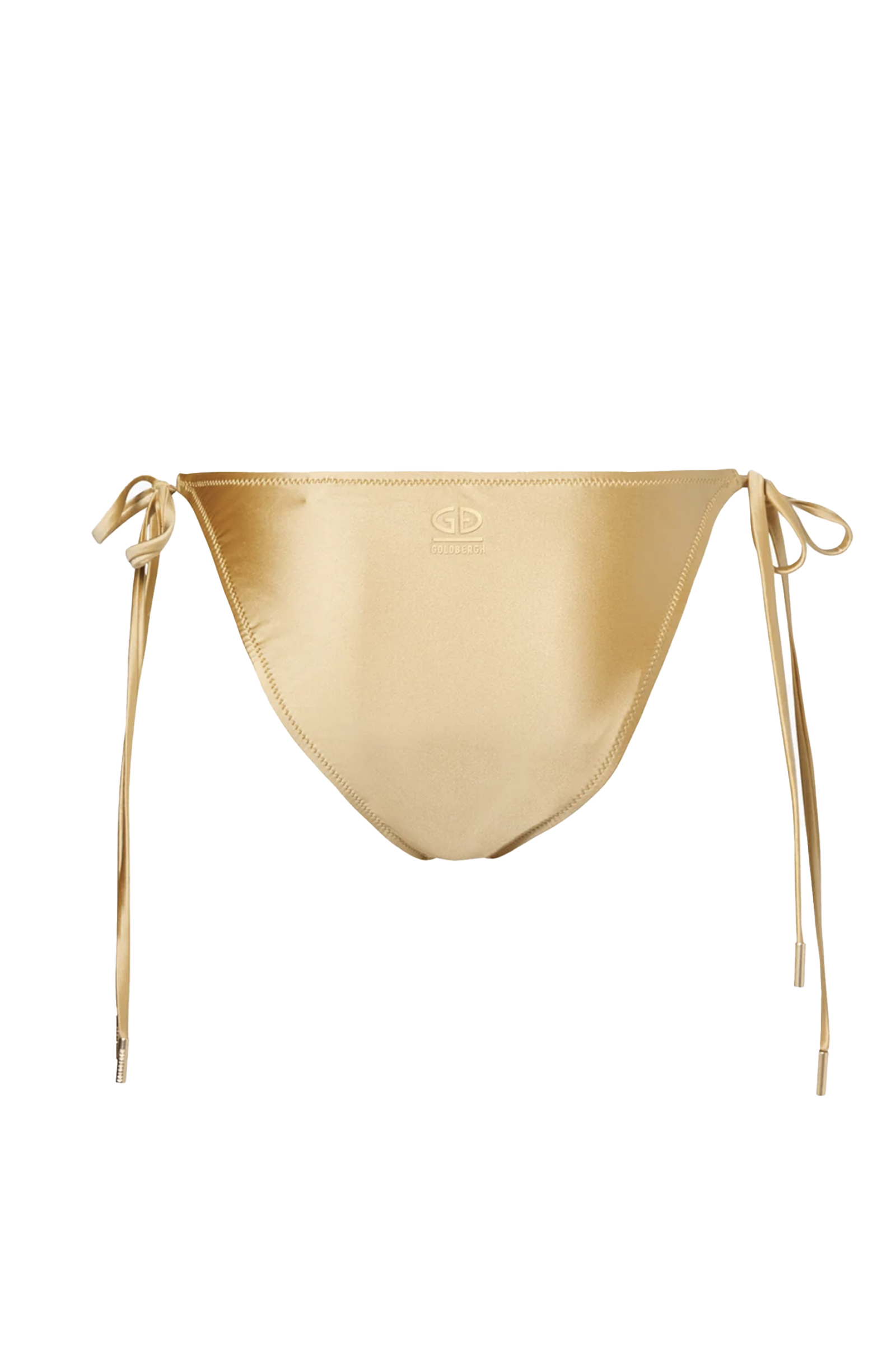 Deze bruine zwemslip van Goldbergh heeft een glanzende finish en kleine steentjes op het voorpand. De zijkanten hebben striksluitingen voor de pasvorm. Op de achterzijde is een logo zichtbaar. Het item is uitgevoerd in een egale kleur met een gladde textuur. Deze bikini slip voelt licht aan en is eenvoudig te combineren voor een dag aan het water.