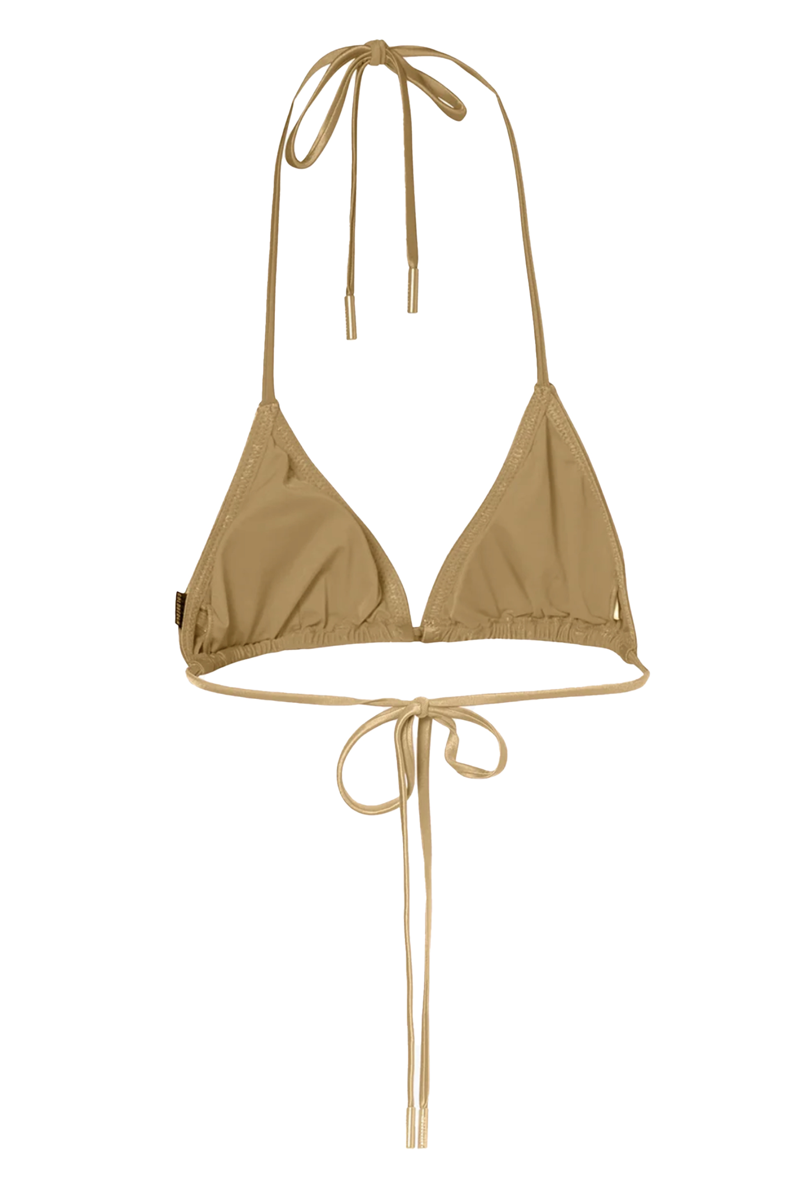 Deze bruine triangel bikini top van Goldbergh heeft een effen kleur met kleine glimmende steentjes op de cups. Het item is voorzien van smalle koordjes die je in de nek en op de rug vastknoopt. De uiteinden van de veters zijn afgewerkt met metalen nestels. De top heeft een subtiel merklabel aan de zijkant van de cup.