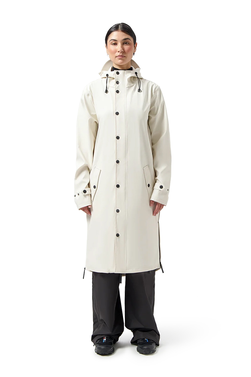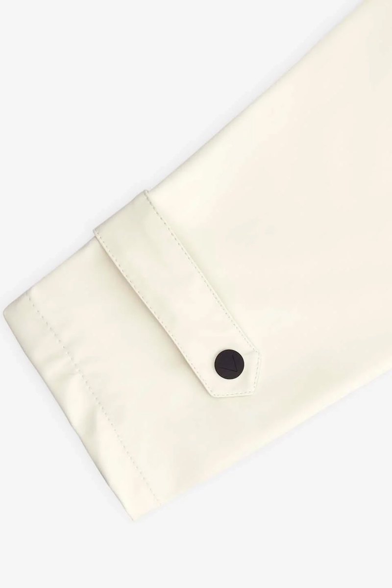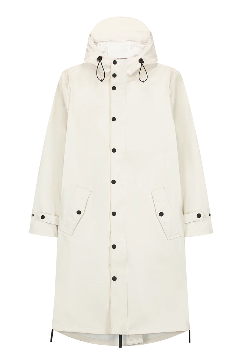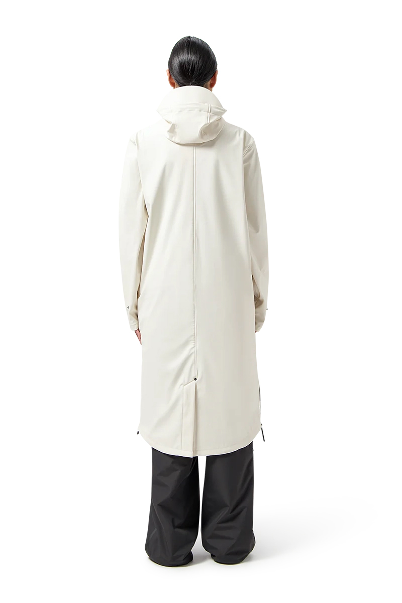 Kenmerkende ritsen aan de zijkant voor poncho-functie. Tweezijdige waterafstotende ritssluiting aan voorzijde voorzien van overslag met drukknopen. Capuchon met verstelbare stoppers en klep. Hoge kraag om mond en neus te beschermen met ritsgarage.