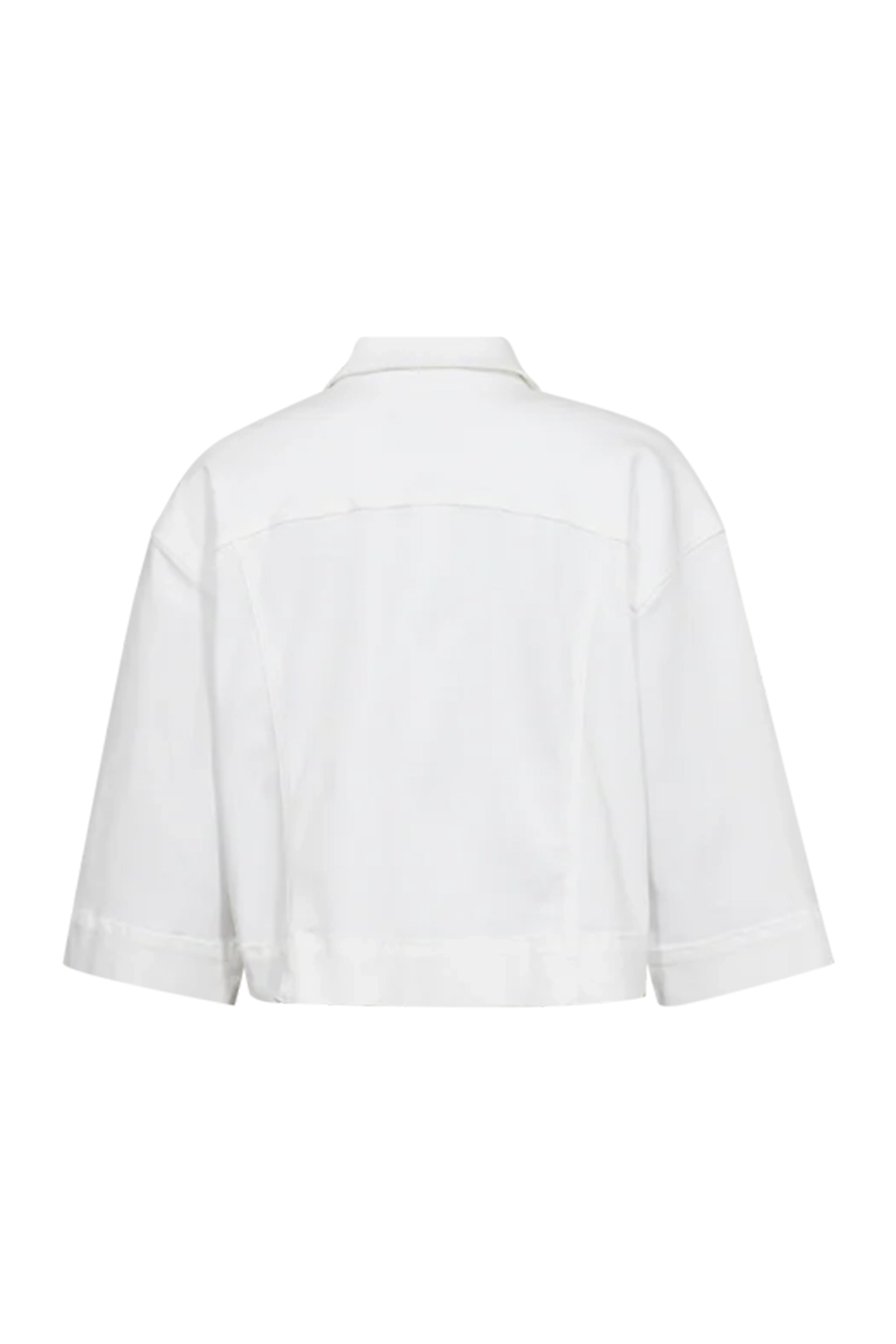 Deze korte dames jas wit van Mos Mosh heeft een kraag, knoopsluiting en borstzakken met klep. Het kledingstuk is uitgevoerd met wijde driekwart mouwen en verticale deelnaden aan de voorzijde.