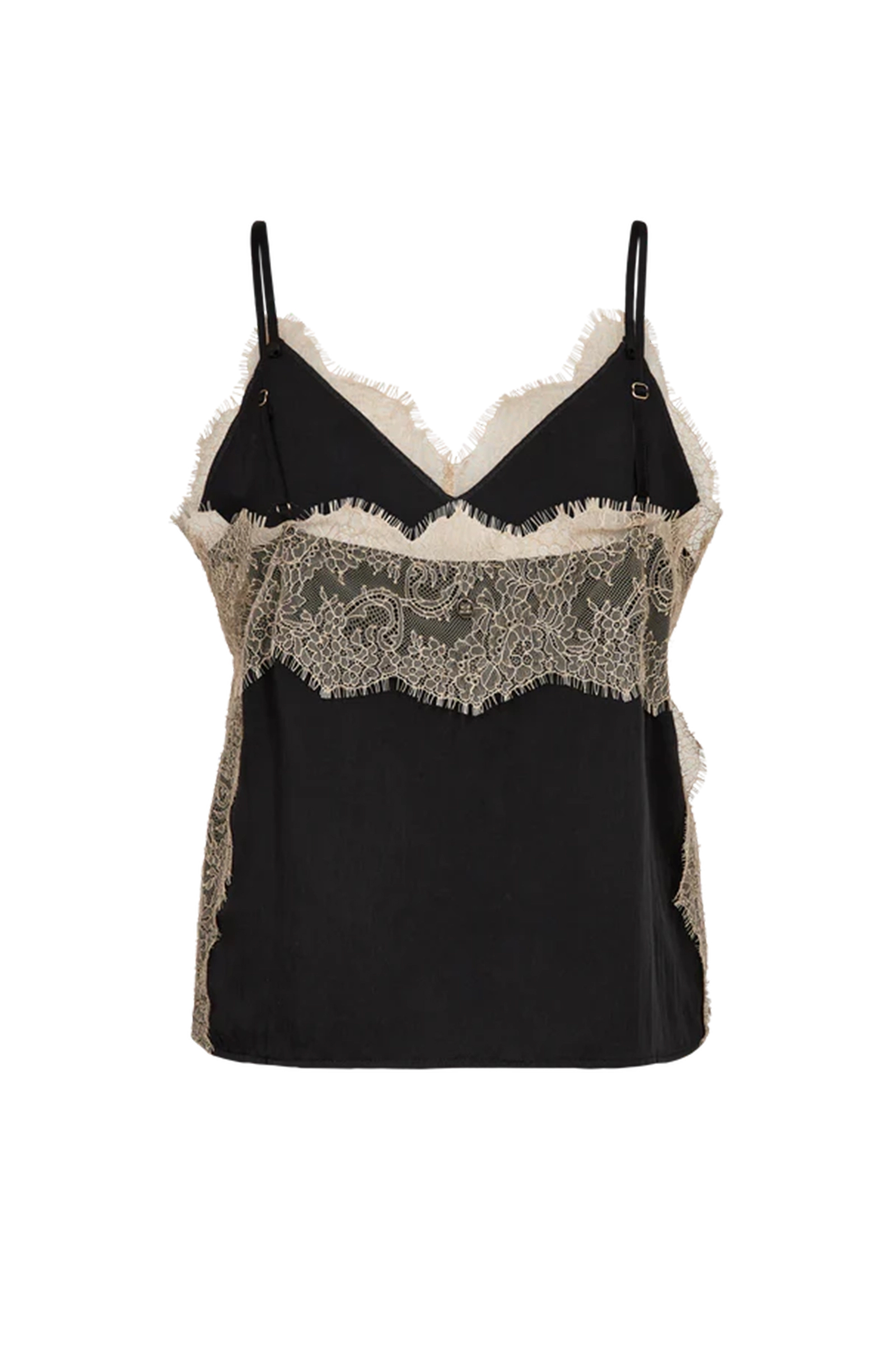 Deze zwarte dames top van Mos Mosh is voorzien van een v-hals met kant. De mmriela annie top heeft dit kanten detail ook aan de zijkanten van het kledingstuk. Met de verstelbare spaghettibandjes stel je de gewenste pasvorm in. De stof valt soepel en heeft een lichte glans.