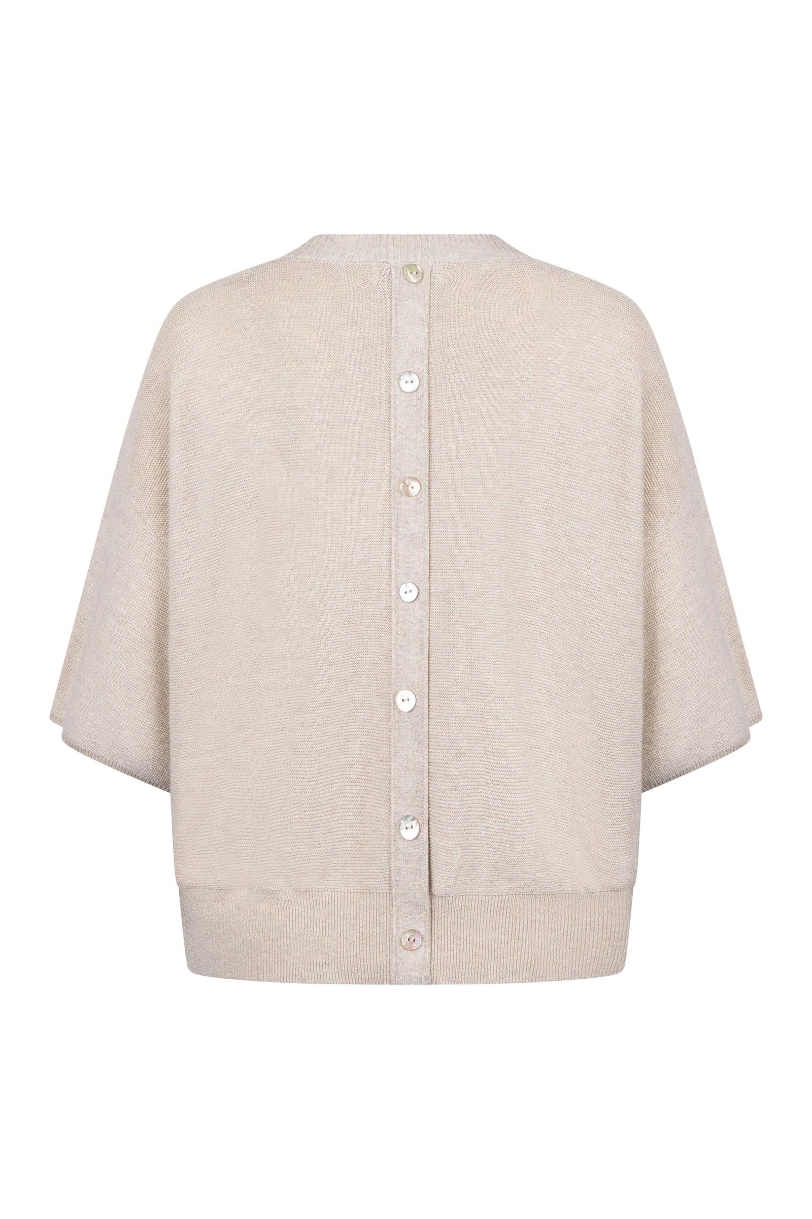 Deze bruine trui van Nukus heeft een subtiele glans door de verwerking van lurex. De pullover is voorzien van een ronde hals en korte mouwen die tot de elleboog vallen. Op de achterzijde bevindt zich een verticale knoopsluiting met lichtgekleurde knopen. Deze dames trui bruin heeft een fijne breistructuur en is afgewerkt met ribgebreide boorden aan de onderzijde.