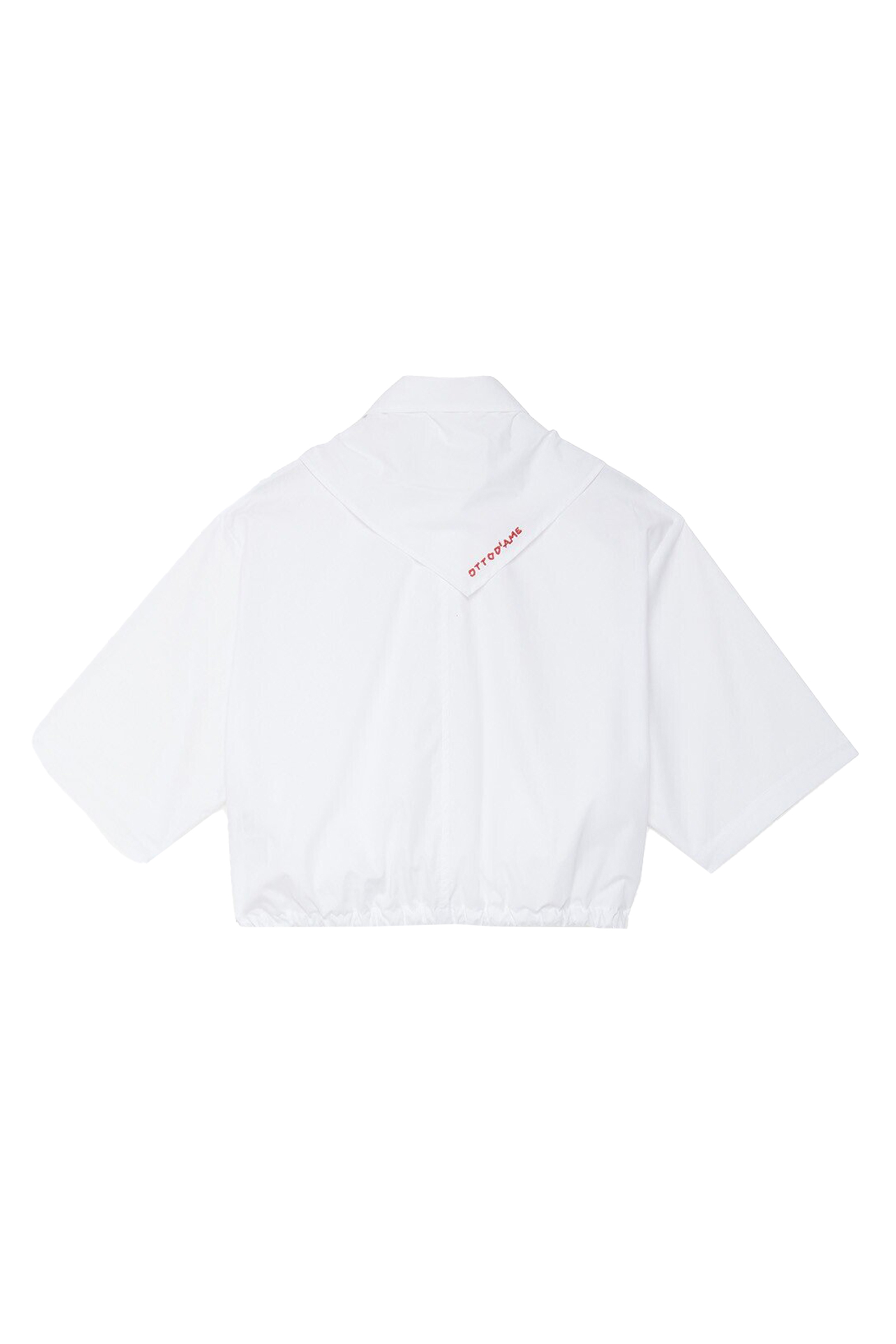 De witte dames blouse van Otto d'Ame, onderdeel van de collectie Dames blouse lange mouw wit, heeft korte, wijde mouwen en een cropped lengte. Dit casual shirt is voorzien van een puntkraag die overgaat in een sjaaldetail dat je kunt strikken. De blouse sluit met een knopenrij aan de voorkant en heeft een opgestikte borstzak. De onderzoom is afgewerkt met een verstelbaar trekkoord.