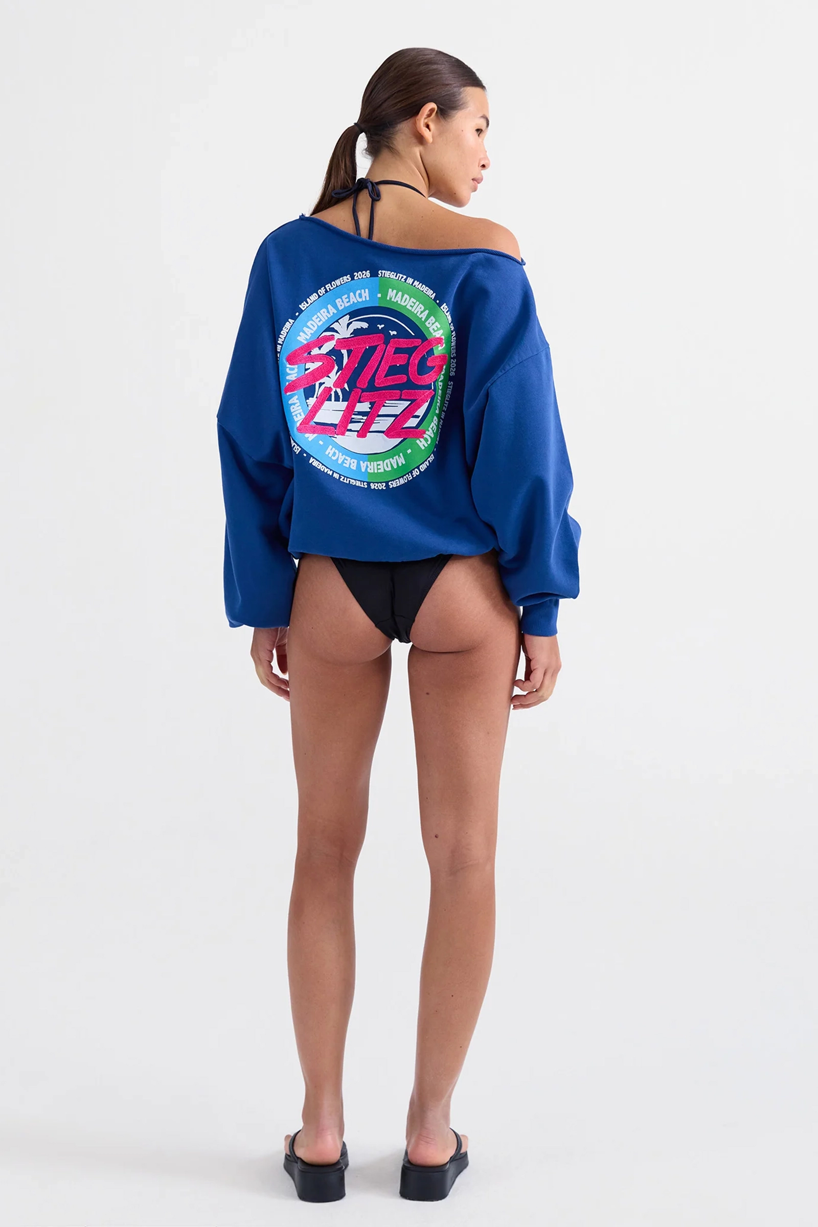 Deze blauwe dames sweater van Stieglitz BV heeft een asymmetrische halslijn die over de schouder valt. Het kledingstuk is voorzien van een kleine ronde print op de borst en een grote grafische afbeelding op de rugzijde met de tekst Madeira Beach en de merknaam. De lange mouwen en de onderzijde zijn afgewerkt met elastische ribboorden. De sweater heeft een ruime pasvorm en een effen kleur.